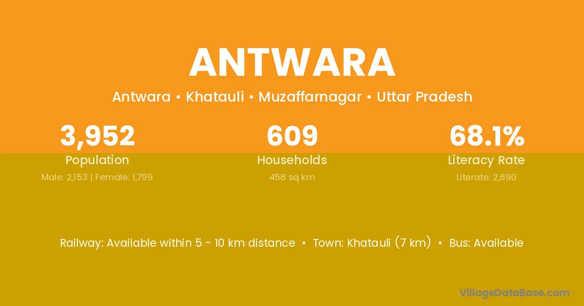 Khatauli (7 km) is the nearest town to Antwara village for major economic activities and is located approximately 7 km away.