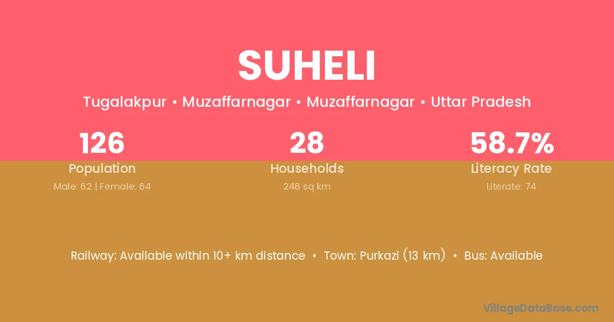 Purkazi (13 km) is the nearest town to Suheli village for major economic activities and is located approximately 13 km away.