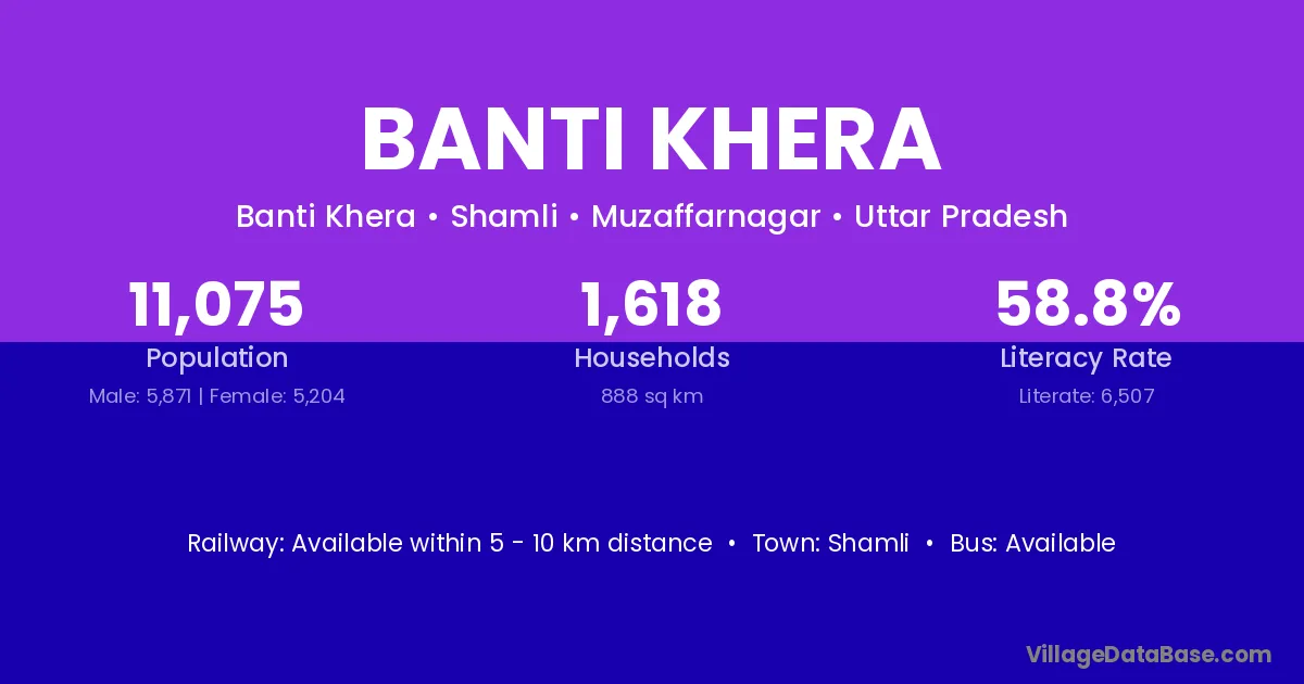 Banti Khera village has a total population of 11,075 people, of which 5,871 are males and 5,204 are females.
