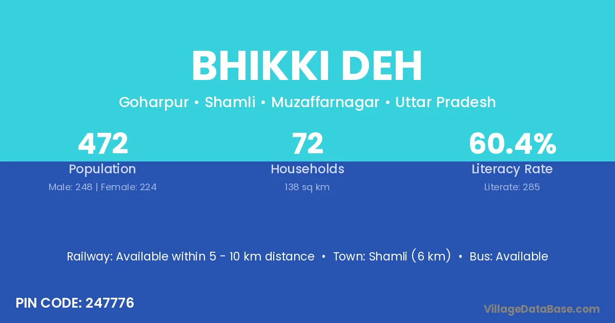Shamli (6 km) is the nearest town to Bhikki Deh village for major economic activities and is located approximately 6 km away.