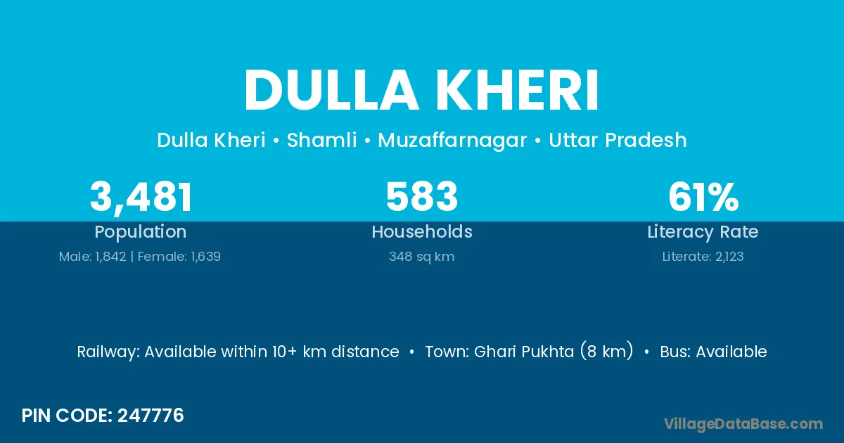 Dulla Kheri village has a total population of 3,481 people, of which 1,842 are males and 1,639 are females.