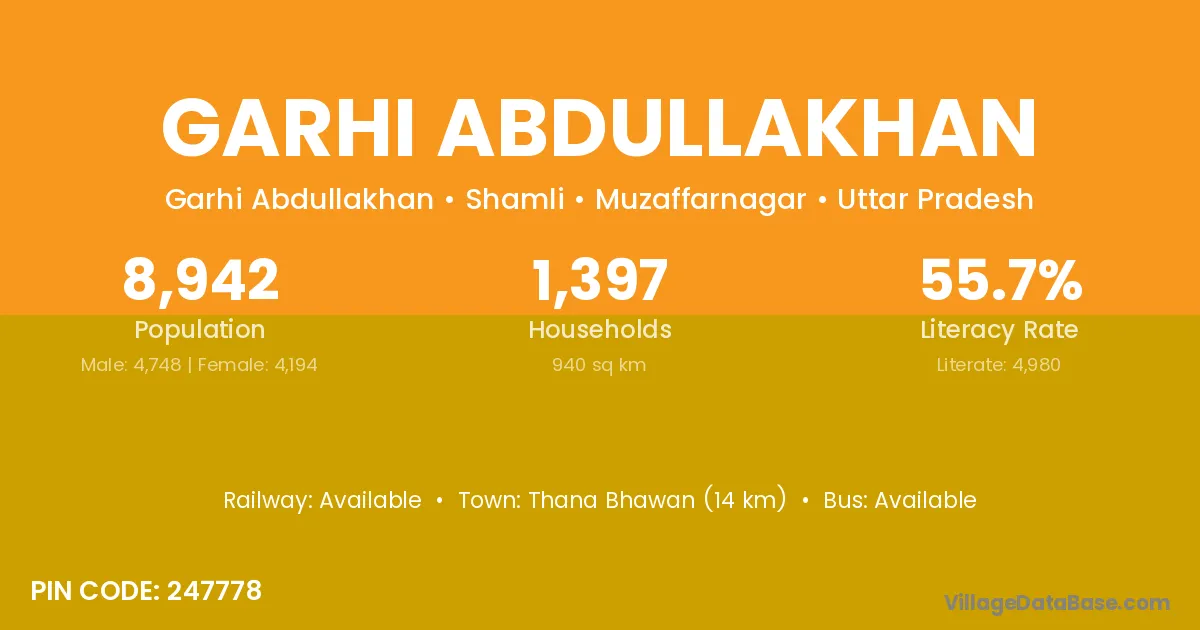 Thana Bhawan (14 km) is the nearest town to Garhi Abdullakhan village for major economic activities and is located approximately 14 km away.