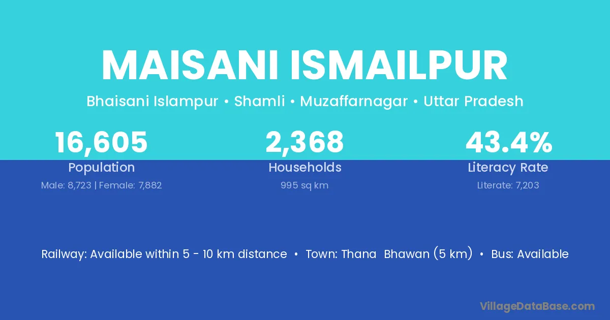 Thana Bhawan (5 km) is the nearest town to Maisani Ismailpur village for major economic activities and is located approximately 5 km away.