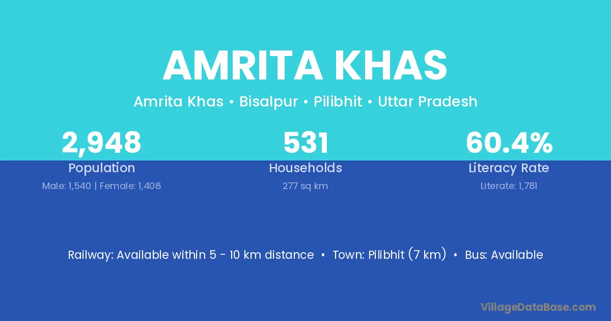 Pilibhit (7 km) is the nearest town to Amrita Khas village for major economic activities and is located approximately 7 km away.