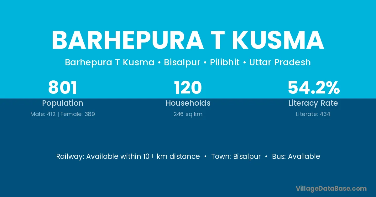 Barhepura T Kusma village has a total population of 801 people, of which 412 are males and 389 are females.