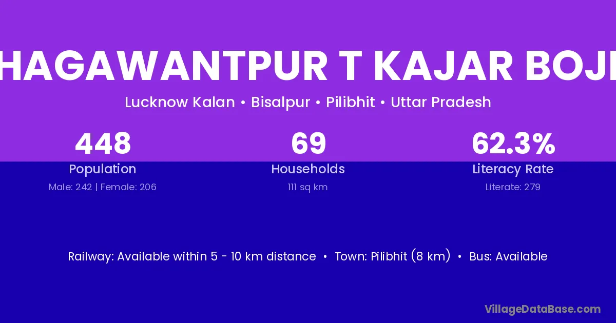 Pilibhit (8 km) is the nearest town to Bhagawantpur T Kajar Bojhi village for major economic activities and is located approximately 8 km away.