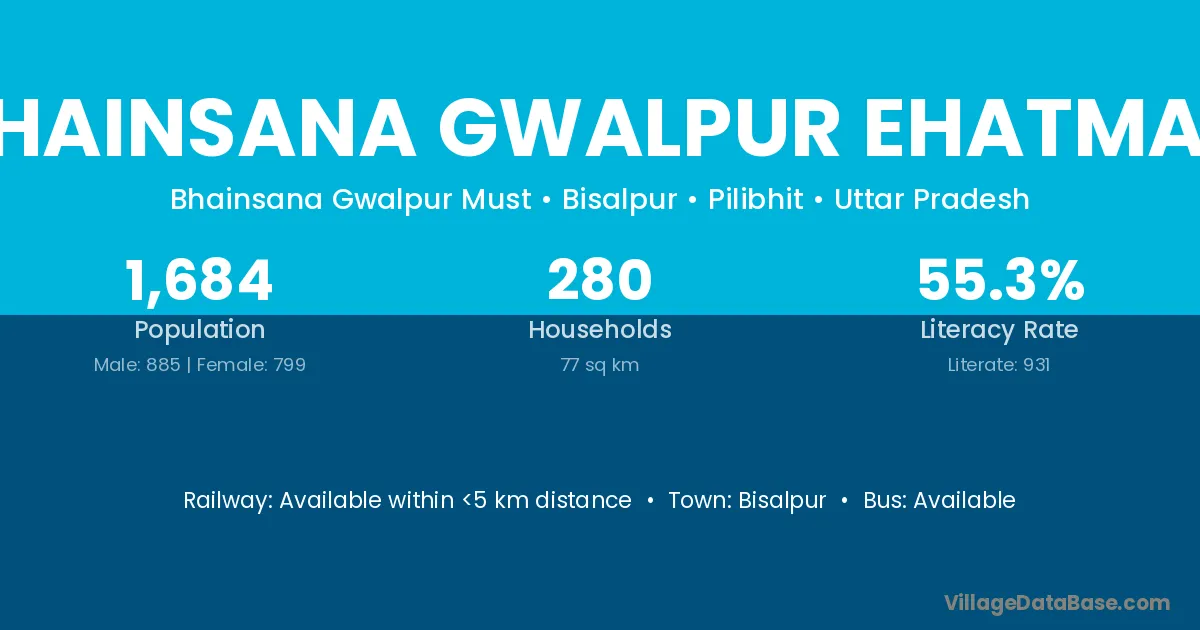 Bhainsana Gwalpur Ehatmali village has a total population of 1,684 people, of which 885 are males and 799 are females.