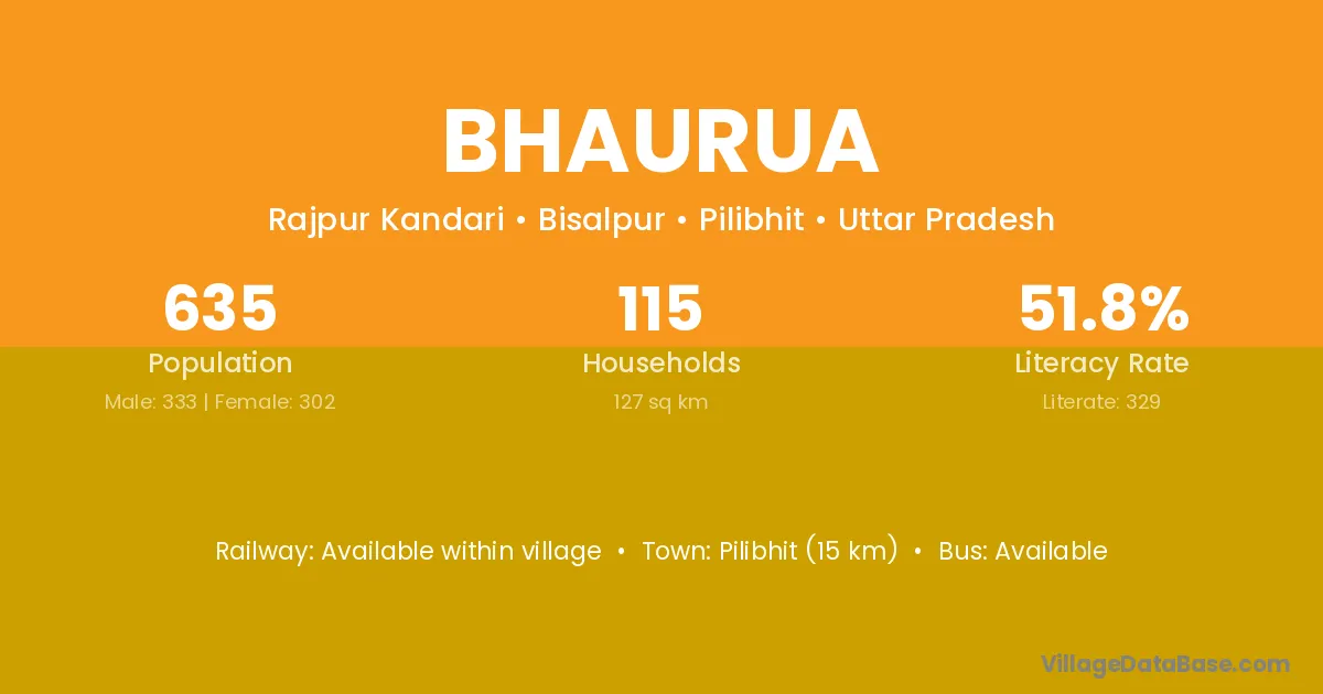 Pilibhit (15 km) is the nearest town to Bhaurua village for major economic activities and is located approximately 15 km away.