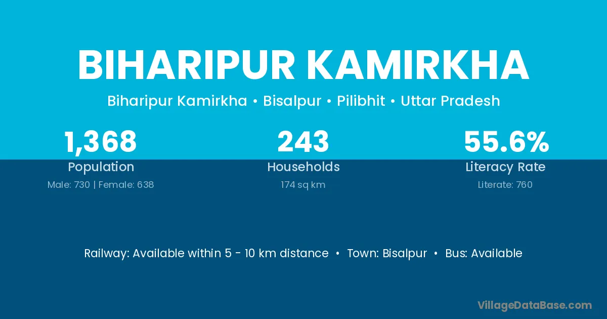 Biharipur Kamirkha village has a total population of 1,368 people, of which 730 are males and 638 are females.
