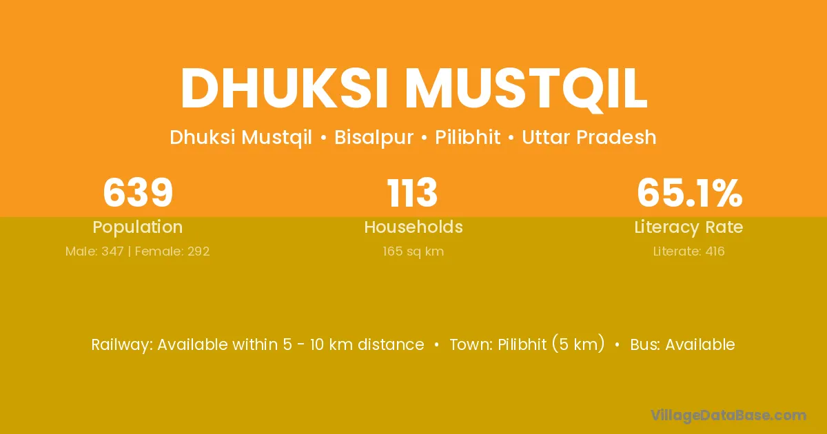 Pilibhit (5 km) is the nearest town to Dhuksi Mustqil village for major economic activities and is located approximately 5 km away.