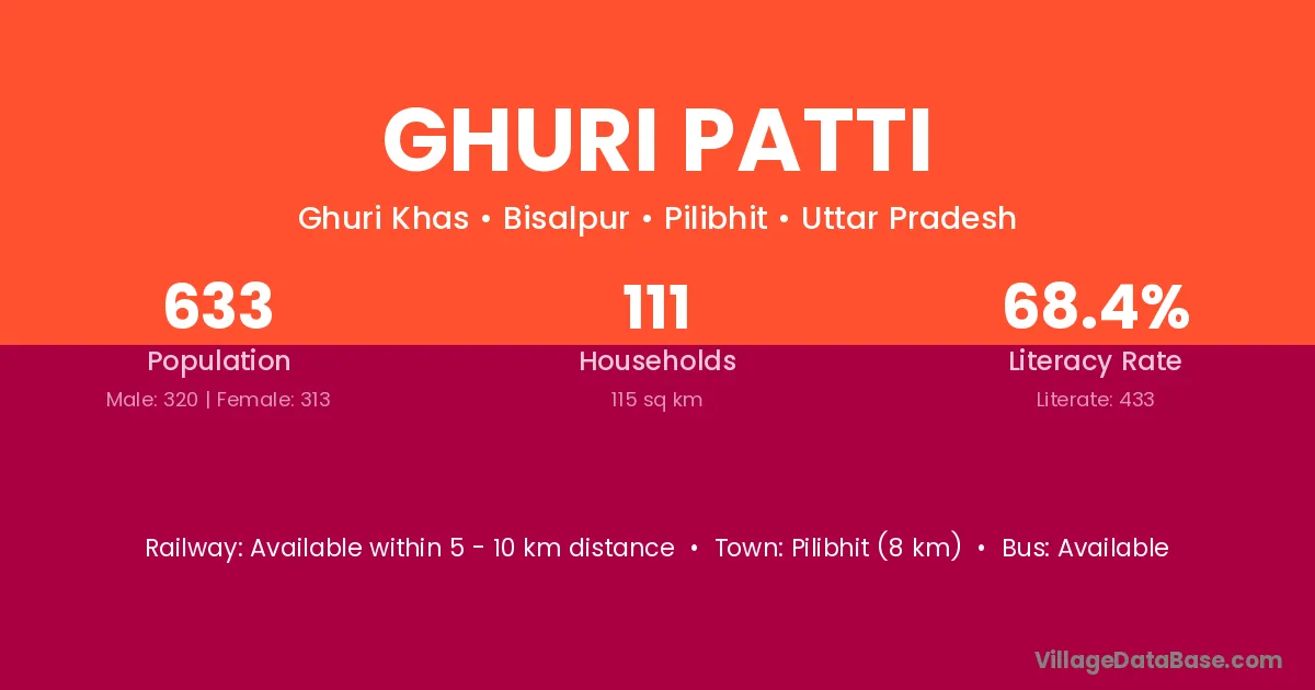Pilibhit (8 km) is the nearest town to Ghuri Patti village for major economic activities and is located approximately 8 km away.