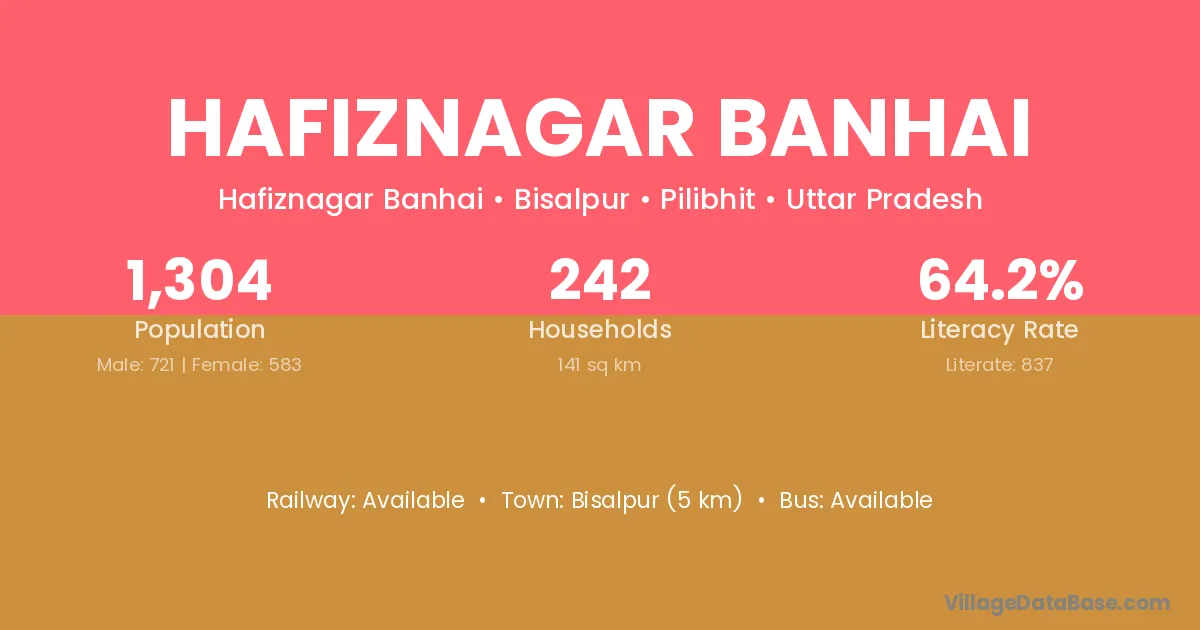 Hafiznagar Banhai village has a total population of 1,304 people, of which 721 are males and 583 are females.