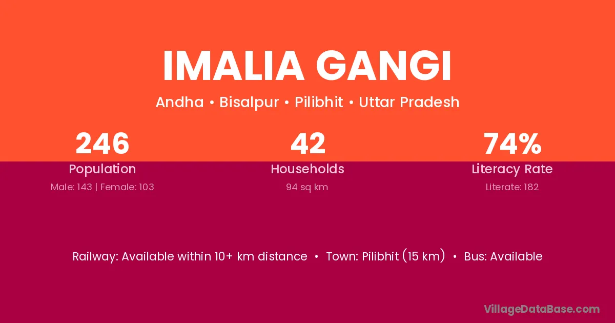 Pilibhit (15 km) is the nearest town to Imalia Gangi village for major economic activities and is located approximately 15 km away.