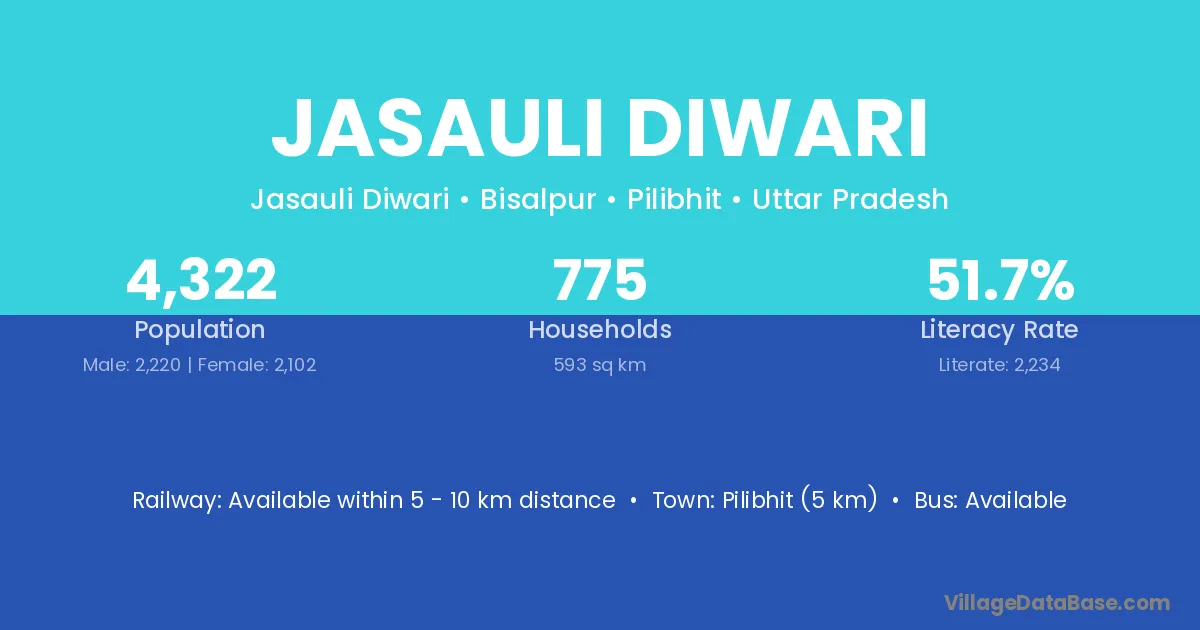 Pilibhit (5 km) is the nearest town to Jasauli Diwari village for major economic activities and is located approximately 5 km away.