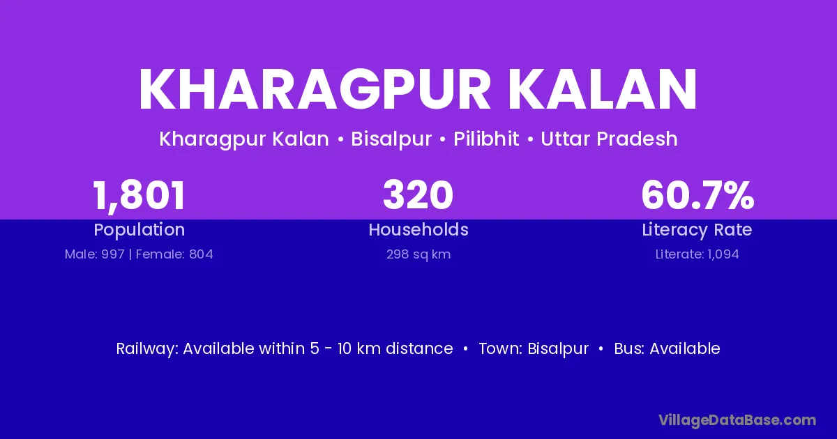 Kharagpur Kalan village has a total population of 1,801 people, of which 997 are males and 804 are females.