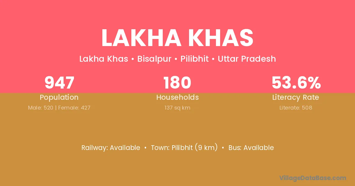 Pilibhit (9 km) is the nearest town to Lakha Khas village for major economic activities and is located approximately 9 km away.