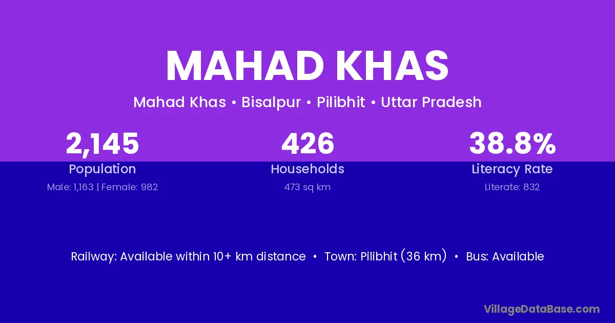 Pilibhit (36 km) is the nearest town to Mahad Khas village for major economic activities and is located approximately 36 km away.