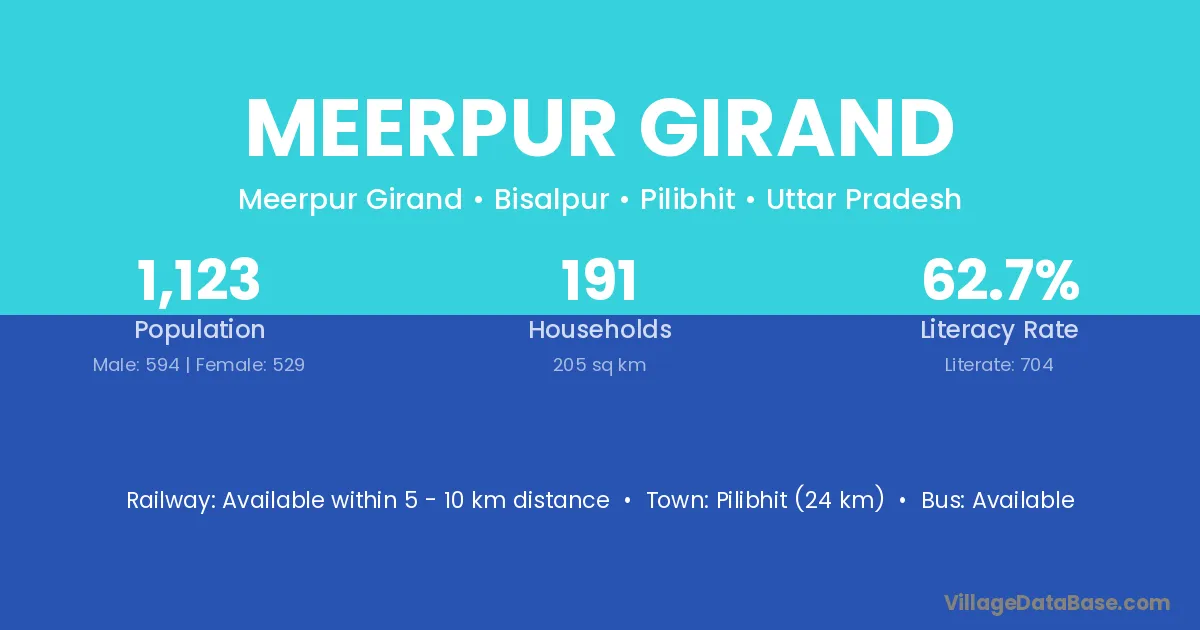 Pilibhit (24 km) is the nearest town to Meerpur Girand village for major economic activities and is located approximately 24 km away.