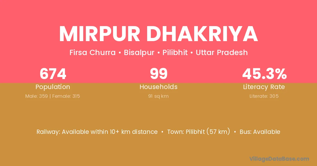 Pilibhit (57 km) is the nearest town to Mirpur Dhakriya village for major economic activities and is located approximately 57 km away.