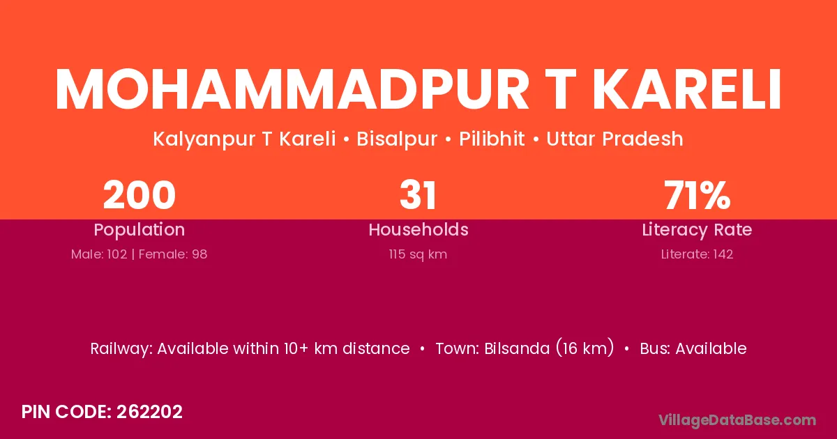 Mohammadpur T Kareli village has a total population of 200 people, of which 102 are males and 98 are females.