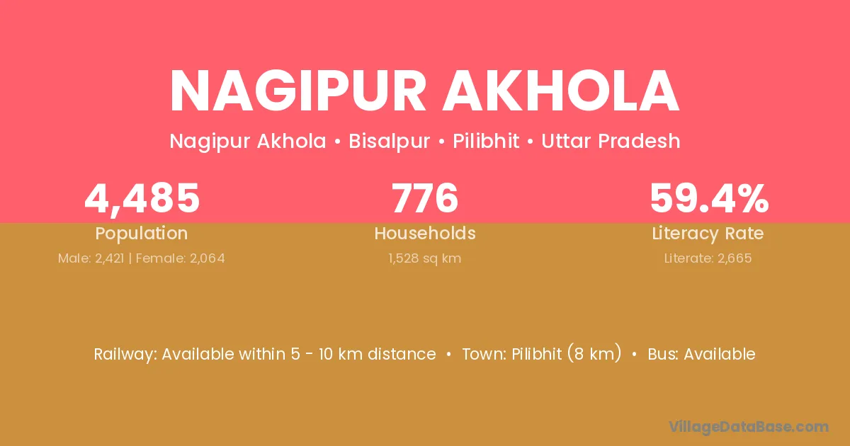 Pilibhit (8 km) is the nearest town to Nagipur Akhola village for major economic activities and is located approximately 8 km away.