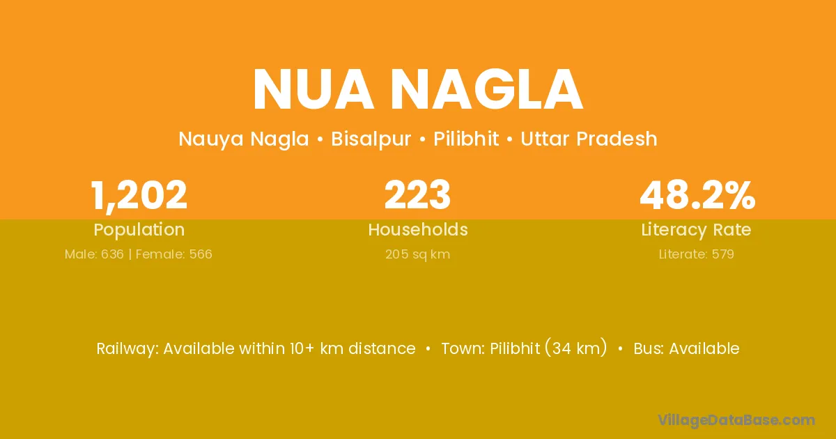 Pilibhit (34 km) is the nearest town to Nua Nagla village for major economic activities and is located approximately 34 km away.