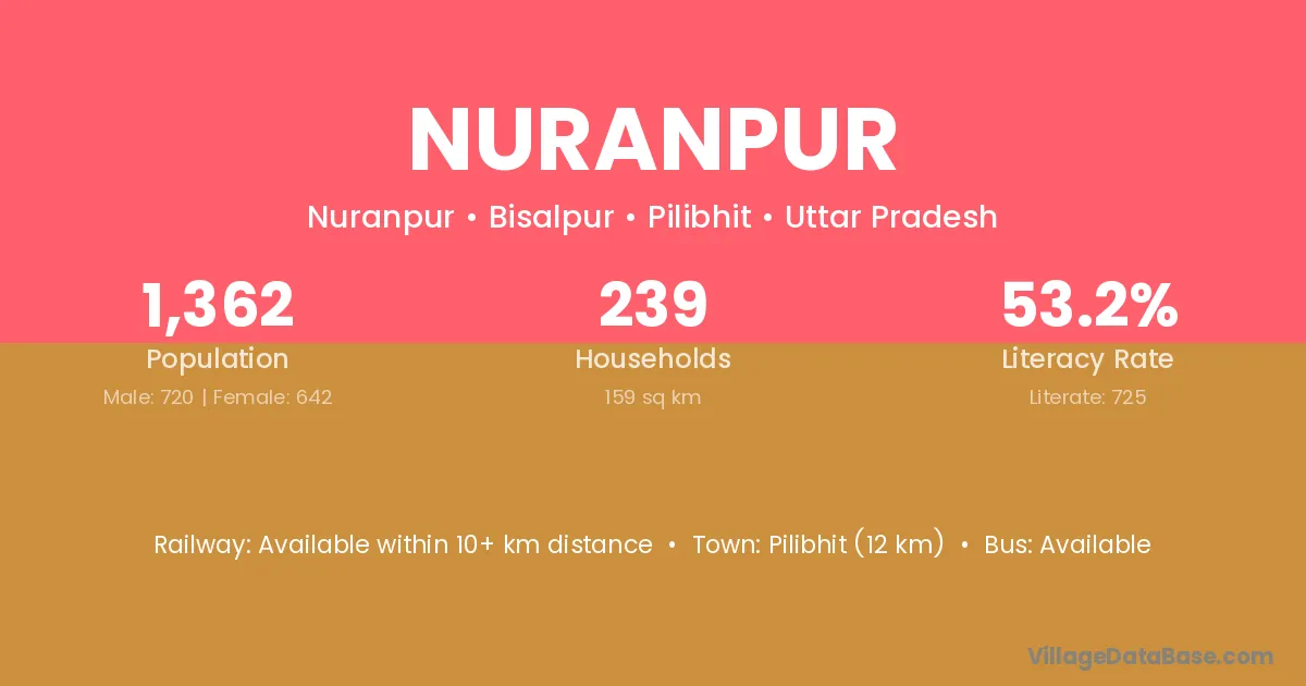 Pilibhit (12 km) is the nearest town to Nuranpur village for major economic activities and is located approximately 12 km away.