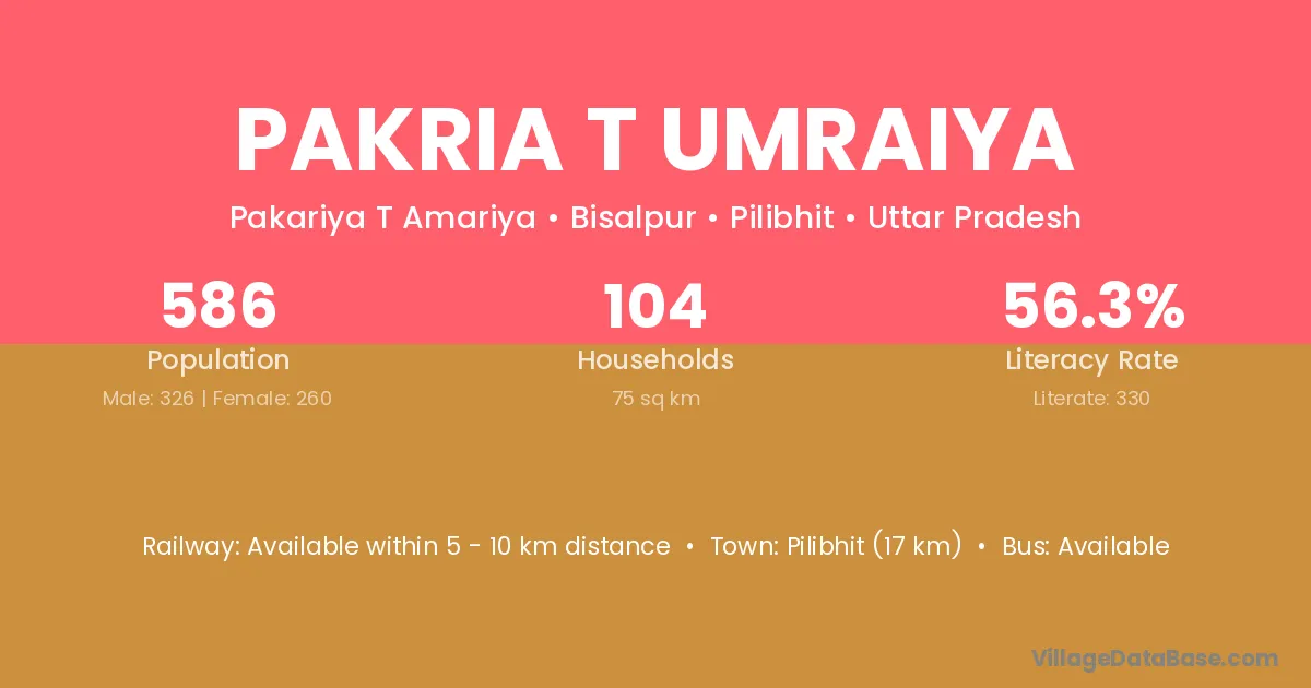 Pilibhit (17 km) is the nearest town to Pakria T Umraiya village for major economic activities and is located approximately 17 km away.