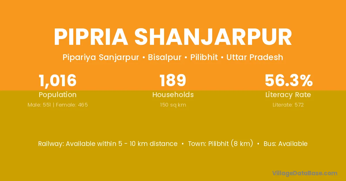 Pilibhit (8 km) is the nearest town to Pipria Shanjarpur village for major economic activities and is located approximately 8 km away.