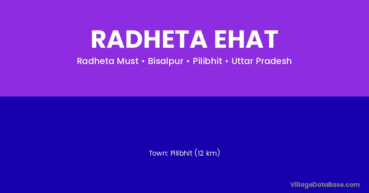 Pilibhit (12 km) is the nearest town to Radheta Ehat village for major economic activities and is located approximately 12 km away.