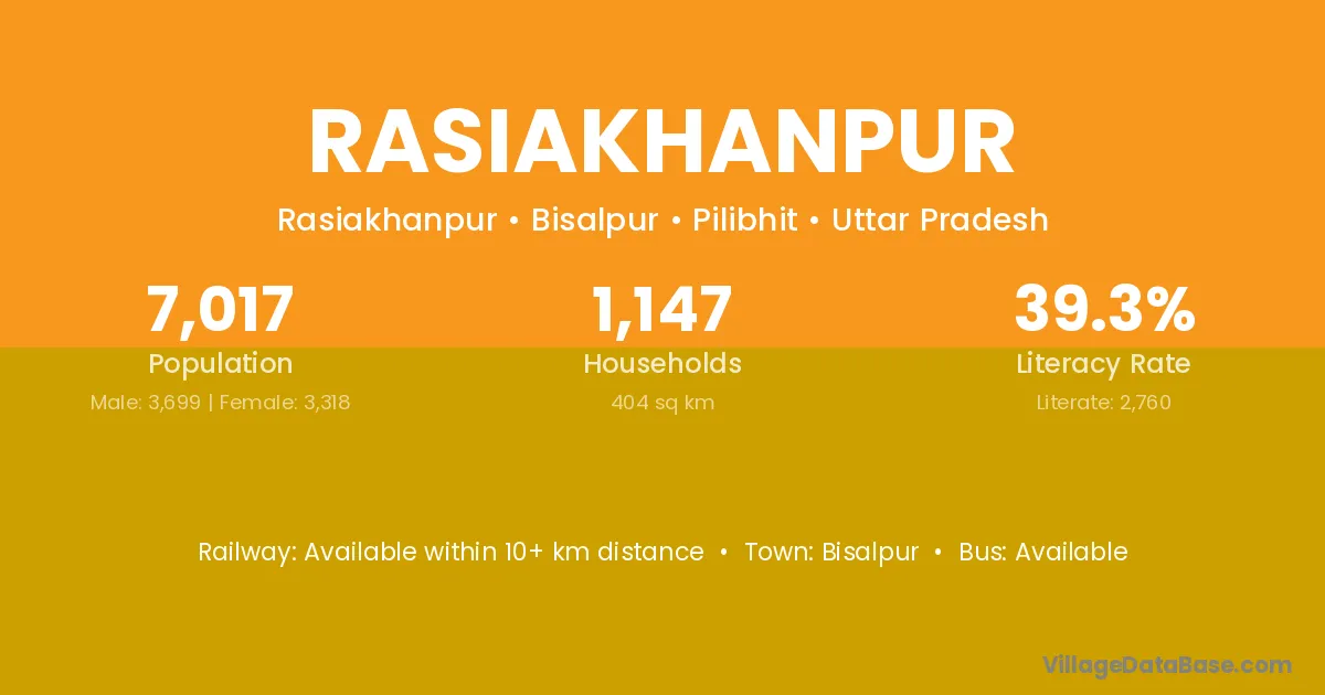 Rasiakhanpur village has a total population of 7,017 people, of which 3,699 are males and 3,318 are females.