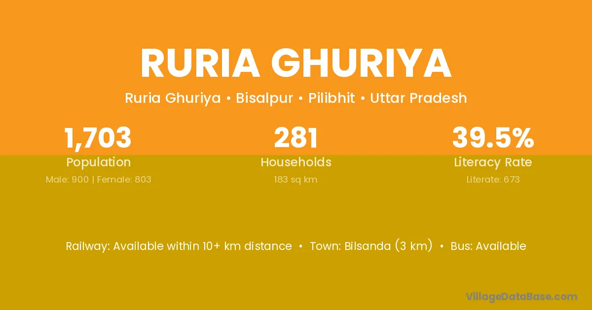 Ruria Ghuriya village has a total population of 1,703 people, of which 900 are males and 803 are females.