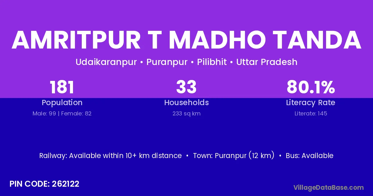Puranpur (12 km) is the nearest town to Amritpur T Madho Tanda village for major economic activities and is located approximately 12 km away.