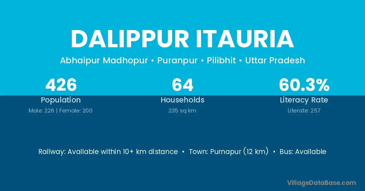 Purnapur (12 km) is the nearest town to Dalippur Itauria village for major economic activities and is located approximately 12 km away.