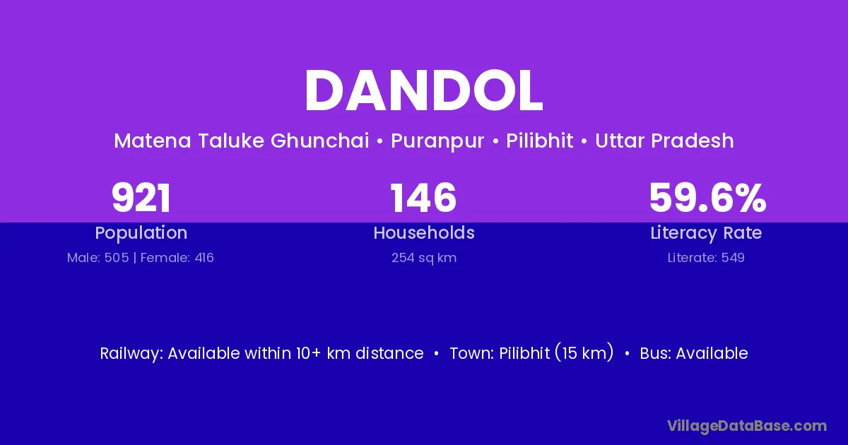 Pilibhit (15 km) is the nearest town to Dandol village for major economic activities and is located approximately 15 km away.