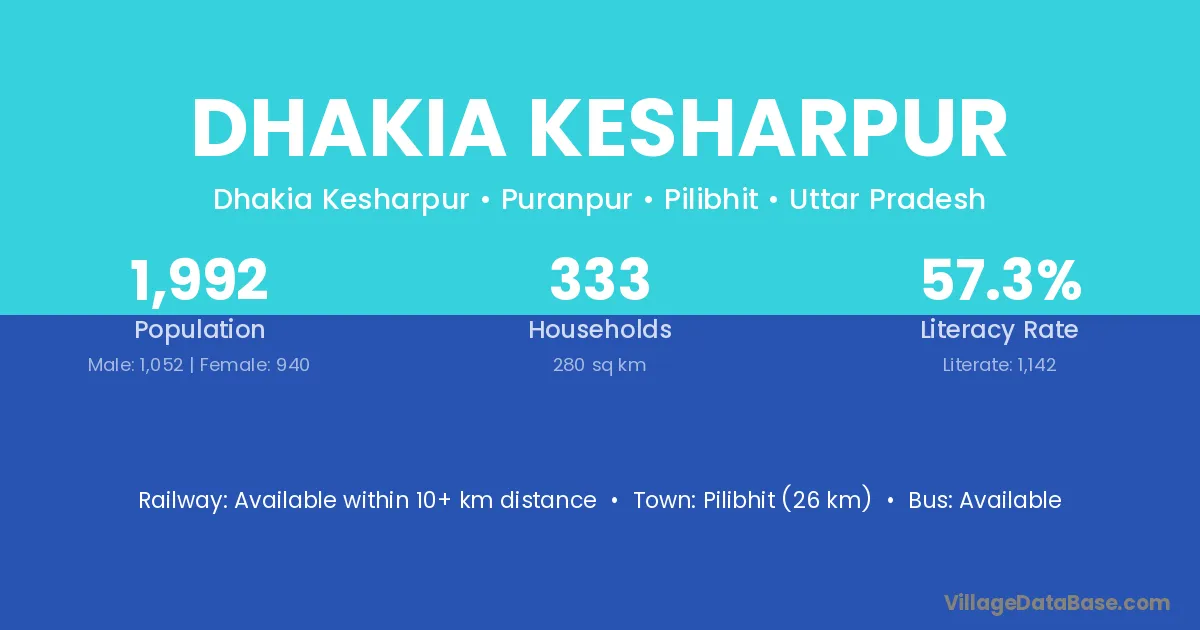 Pilibhit (26 km) is the nearest town to Dhakia Kesharpur village for major economic activities and is located approximately 26 km away.