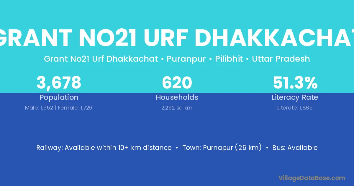Purnapur (26 km) is the nearest town to Grant No21 Urf Dhakkachat village for major economic activities and is located approximately 26 km away.