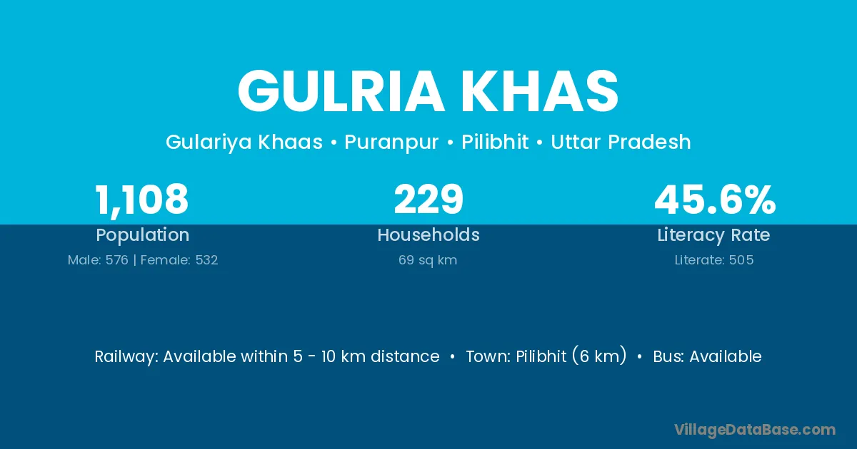 Pilibhit (6 km) is the nearest town to Gulria Khas village for major economic activities and is located approximately 6 km away.
