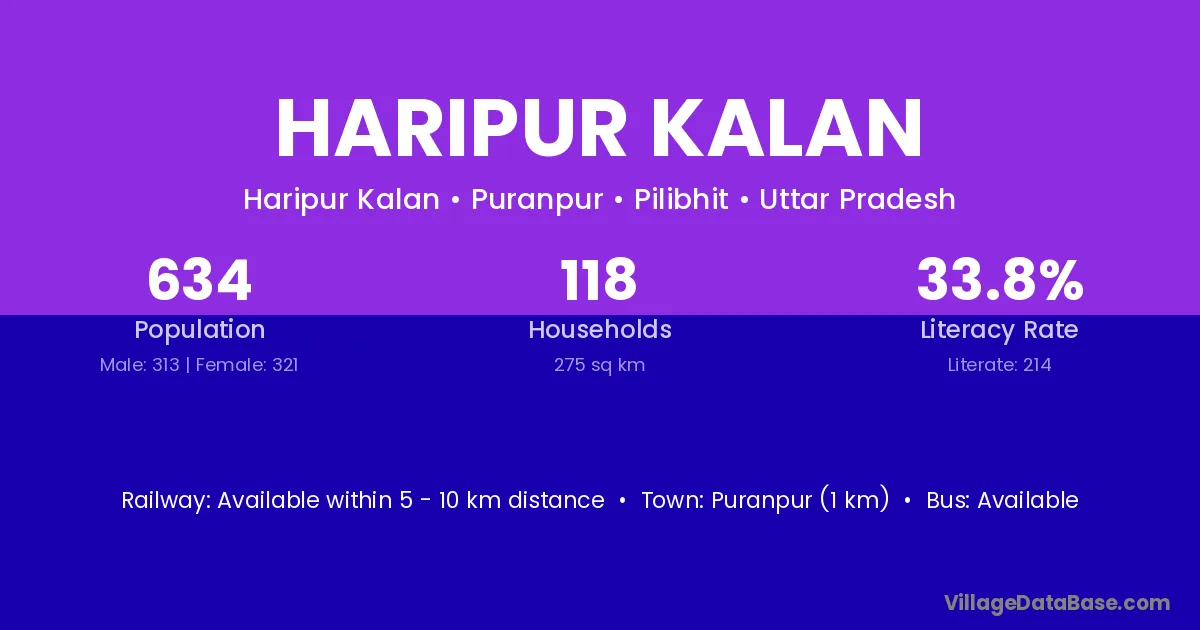 Puranpur (1 km) is the nearest town to Haripur Kalan village for major economic activities and is located approximately 1 km away.