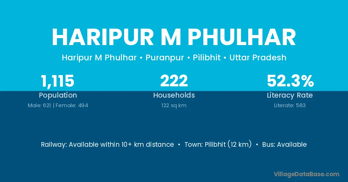 Pilibhit (12 km) is the nearest town to Haripur M Phulhar village for major economic activities and is located approximately 12 km away.