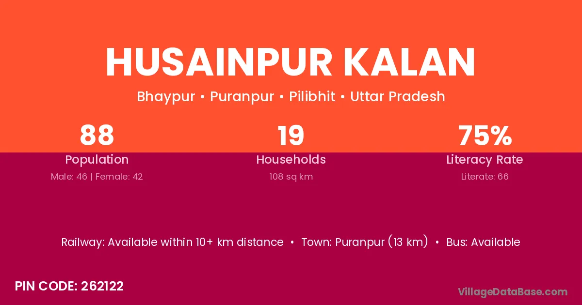 Puranpur (13 km) is the nearest town to Husainpur Kalan village for major economic activities and is located approximately 13 km away.