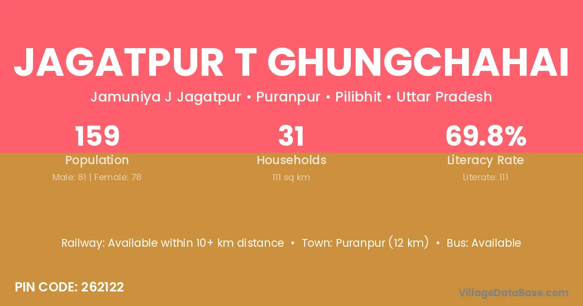Jagatpur T Ghungchahai village has a total population of 159 people, of which 81 are males and 78 are females.
