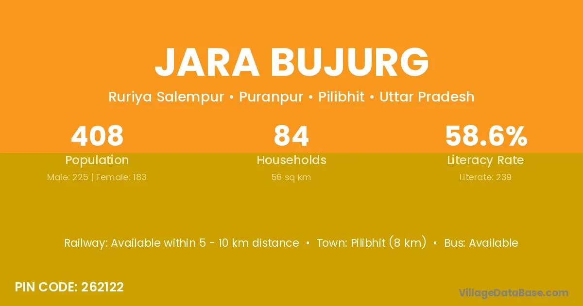 Pilibhit (8 km) is the nearest town to Jara Bujurg village for major economic activities and is located approximately 8 km away.