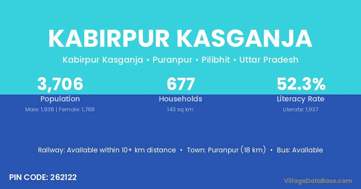 Puranpur (18 km) is the nearest town to Kabirpur Kasganja village for major economic activities and is located approximately 18 km away.