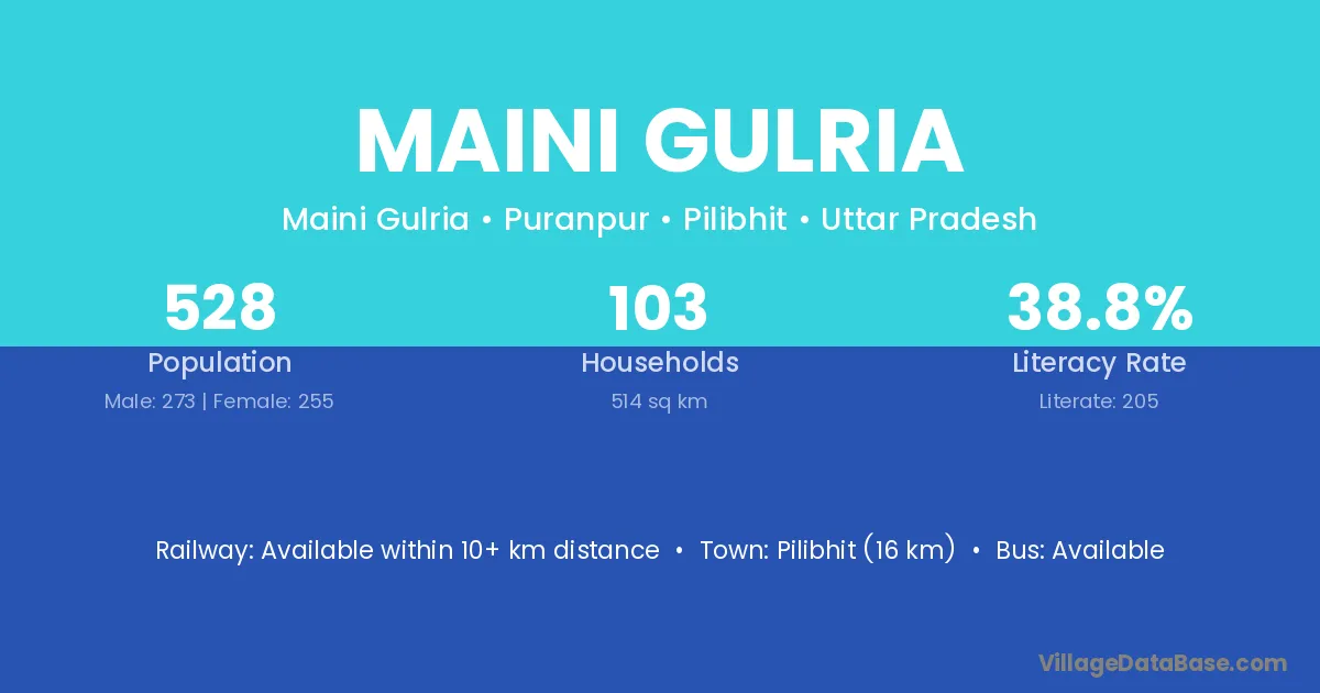 Pilibhit (16 km) is the nearest town to Maini Gulria village for major economic activities and is located approximately 16 km away.