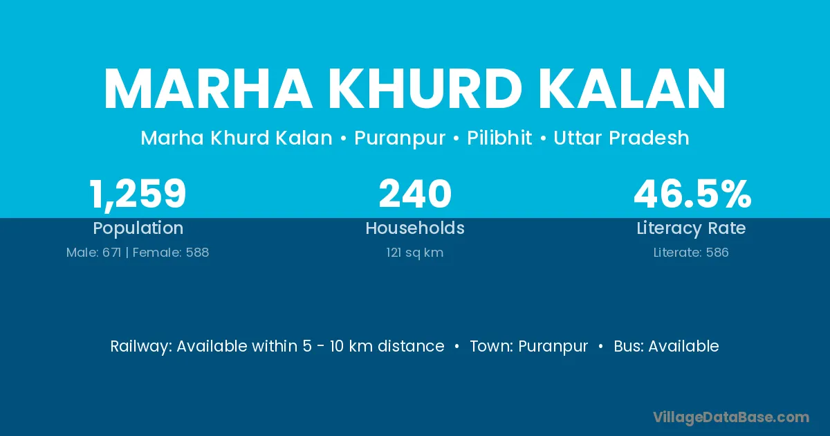 Marha Khurd Kalan village has a total population of 1,259 people, of which 671 are males and 588 are females.