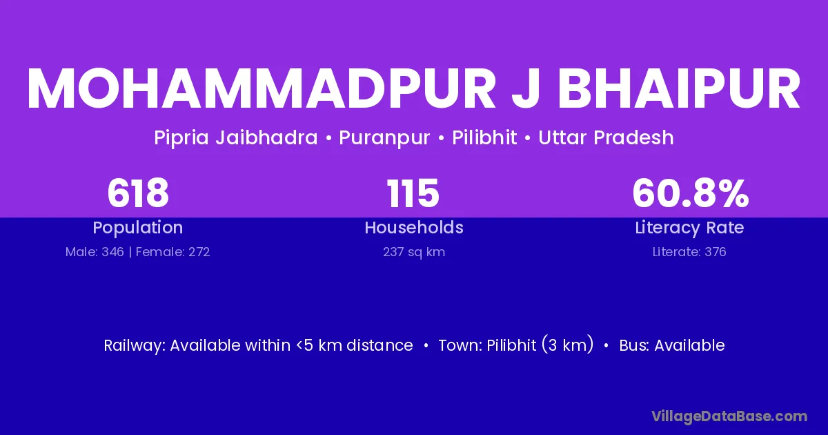 Pilibhit (3 km) is the nearest town to Mohammadpur J Bhaipur village for major economic activities and is located approximately 3 km away.