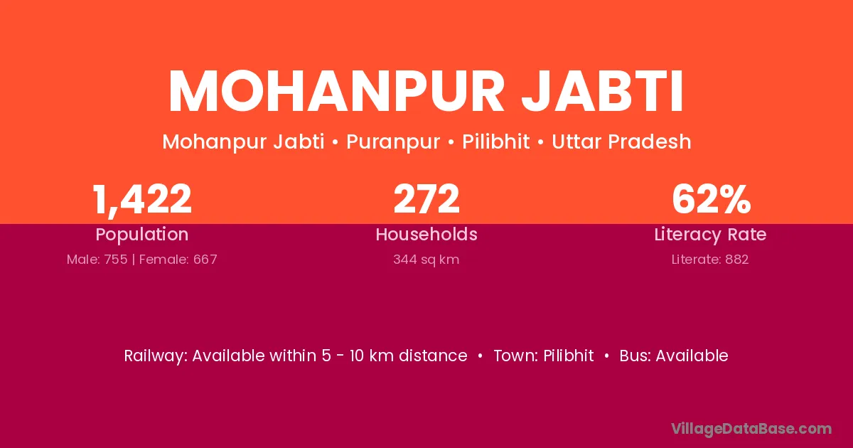 Pilibhit is the nearest town to Mohanpur Jabti village for major economic activities
