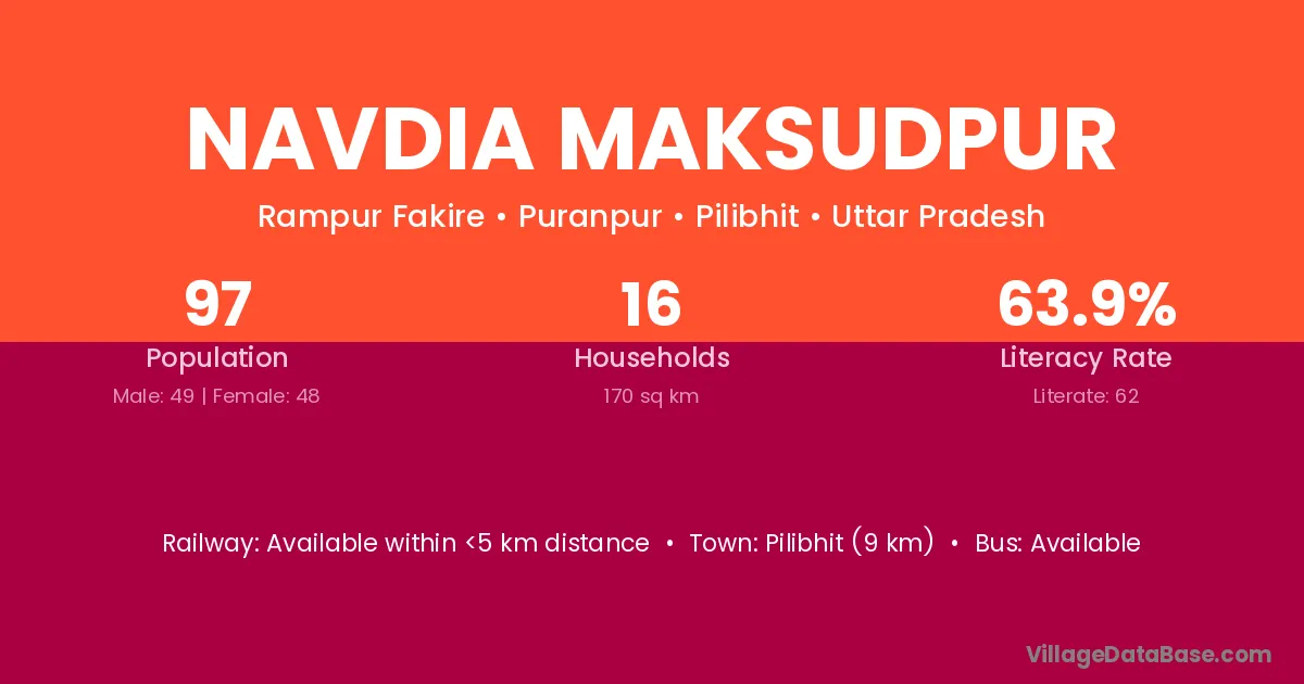 Pilibhit (9 km) is the nearest town to Navdia Maksudpur village for major economic activities and is located approximately 9 km away.