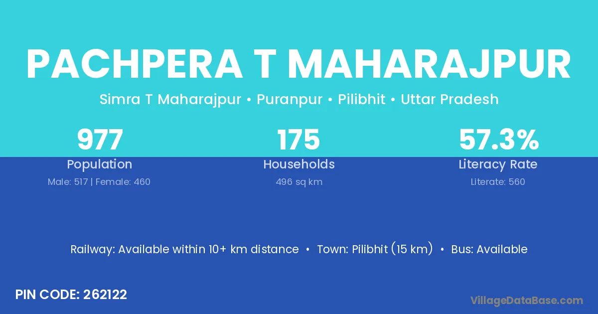 Pilibhit (15 km) is the nearest town to Pachpera T Maharajpur village for major economic activities and is located approximately 15 km away.